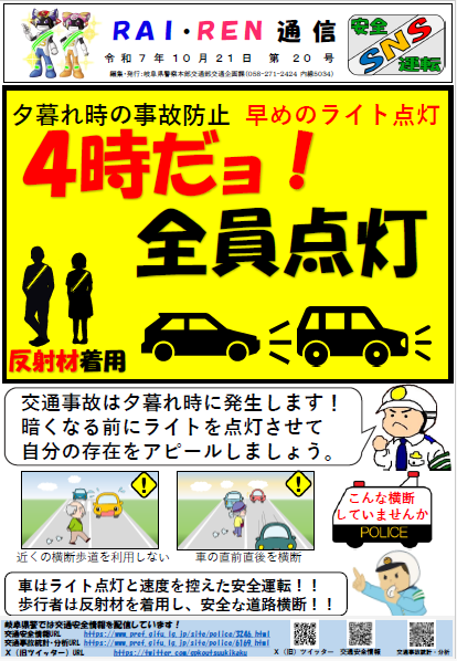 秋から年末にかけて日没時間が早まり、夕暮れ時、夜間の交通事故が多発する傾向があります。