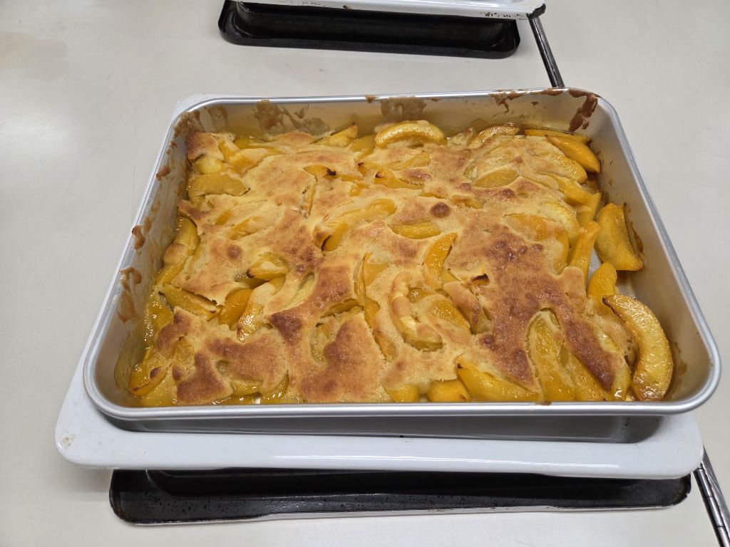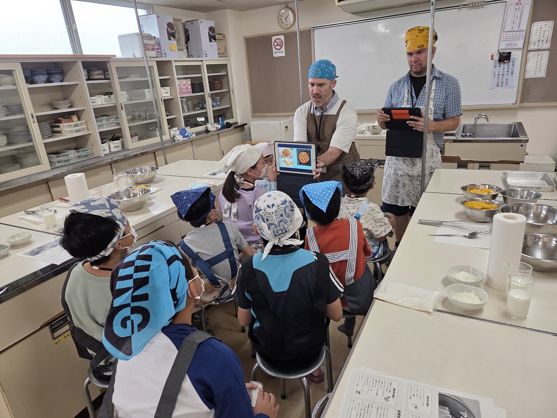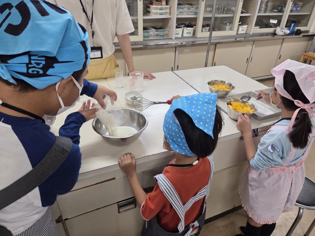 市のALTを講師にお招きし、アメリカのお菓子「コブラー」を作りました。学年に応じて難易度を調整し、簡単な方法と少し難しい方法のグループに分かれ、協力しながら調理を行いました。オーブンで焼いている間には、講師と一緒にお菓子に関するジェスチャーゲームを行い、子どもたちが積極的に英語で答える様子が印象深く、温かな時間を過ごしました。調理後は、完成した2種類のコブラーを食べ比べ、みんなでとても美味しくいただきました。ご参加いただいた皆さま、誠にありがとうございました。来年度も多くの皆さまのご参加を心よりお待ちしております。