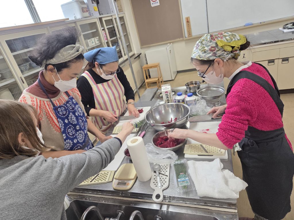 岐阜県国際交流課の国際交流員で、リトアニア出身のロベルタ・グヴァイズディカイテーさんを講師にお迎えし、「シャルティバルシチェイ(冷製ボルシチ)」と「ジャガイモパンケーキ」を作りました。「シャルティバルシチェイ」ではあまり調理する機会の少ないビーツを使用したり、「ジャガイモパンケーキ」では油で生地を揚げたりするなど、普段経験しないリトアニアならではの料理に挑戦しました。