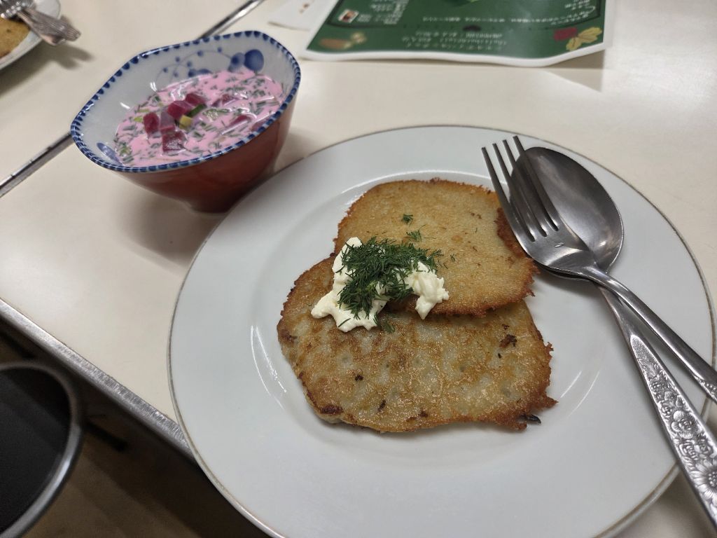 料理後は参加者全員でテーブルを囲んで試食を行いました。「シャルティバルシチェイ」はビーツの優しい甘みとさっぱりとした爽やかな味わいが特徴で、とても食べやすい一品でした。「ジャガイモパンケーキ」は食べごたえがありつつも、サワークリームの酸味との相性が抜群で、参加者の皆さんは最後まで召し上がっていました。