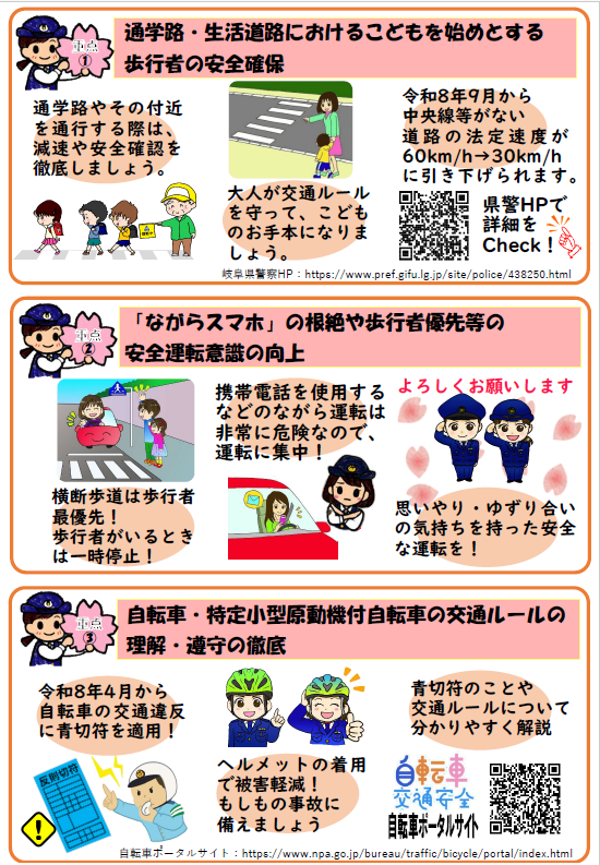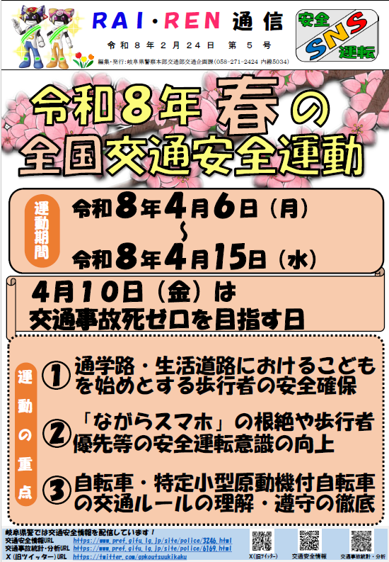 2026年02月12日 春の全国交通安全運動 春の交全国交通安全運動が令和8年4月6日から15日まで行われます。 交通事故に十分注意し、子どもや高齢者を事故から守りましょう。また、自転車等に乗るときはヘルメットの着用と、交通ルールの遵守を徹底して、交通事故死ゼロを目指しましょう。 令和8年春の全国交通安全運動(pdf形式:1248KB)